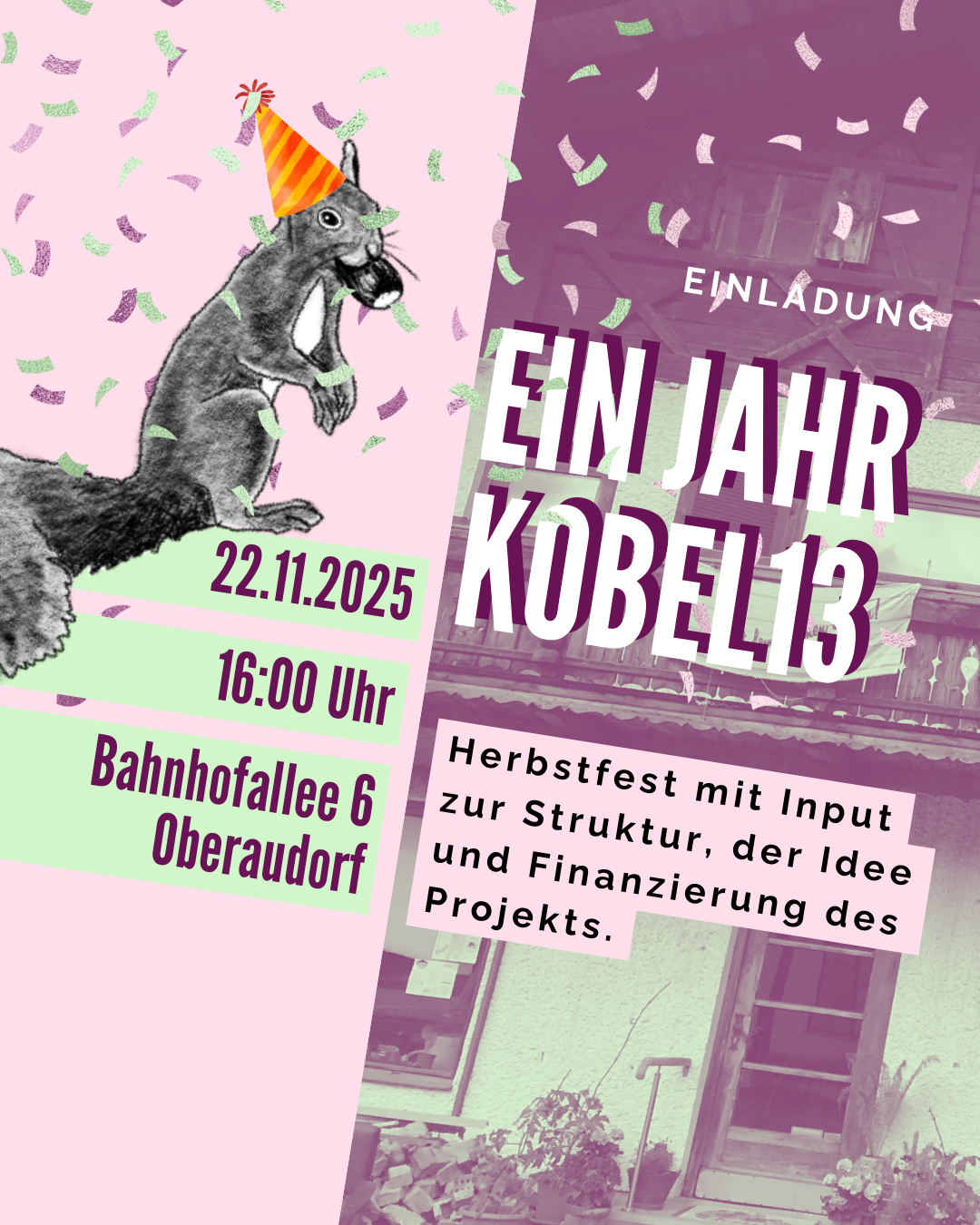 Wir sind gerade sieben Menschen und ein Hund mit verschiedenen Hintergründen, Sozialisierungen und aus verschiedenen linkspolitischen Kontexten, die sich in verschiedenen Lebensphasen befinden. Was uns eint ist der Wunsch nach kollektivem Leben und Wohnen – an einem Ort, der von uns selbst gestaltet und verwaltet wird, der uns Rückzugsraum bietet aber auch Platz ihn zu öffnen für Menschen, die wie wir versuchen diese Gesellschaft jeden Tag ein kleines und großes bisschen angenehmer zu machen. Darum wollen wir gemeinsam mit dem Mietshäuser Syndikat die Kobel13 in Oberaudorf hegen, pflegen und beleben.