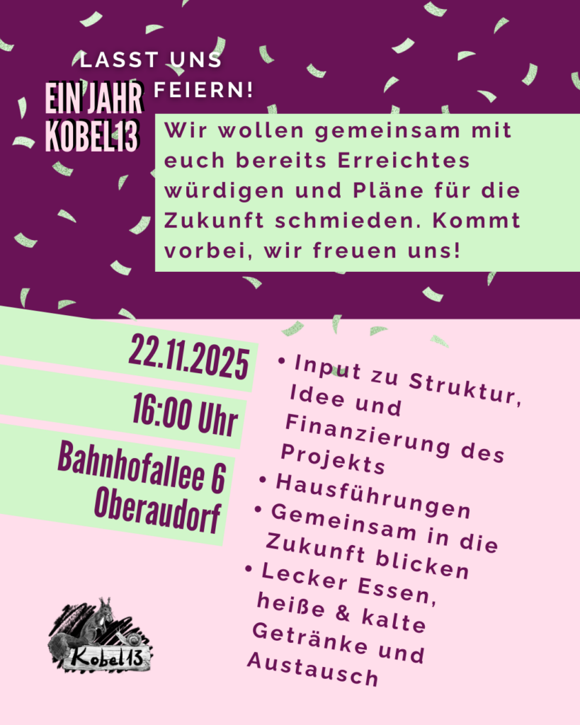 Ihr ward sehr geduldig – aber jetzt wird endlich gefeiert! Unter dem Motto Kobel, Kürbis und Kredite wollen wir mit euch gemeinsam unseren ersten Geburtstag mit einem Herbstfest am 22.11.2025 ab 16 Uhr begehen.